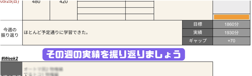 また、下記のように、全体シートの週ごとの備考欄には学習の指針などを個別に書いているので、迷いなく学習していただけます。